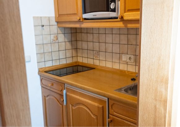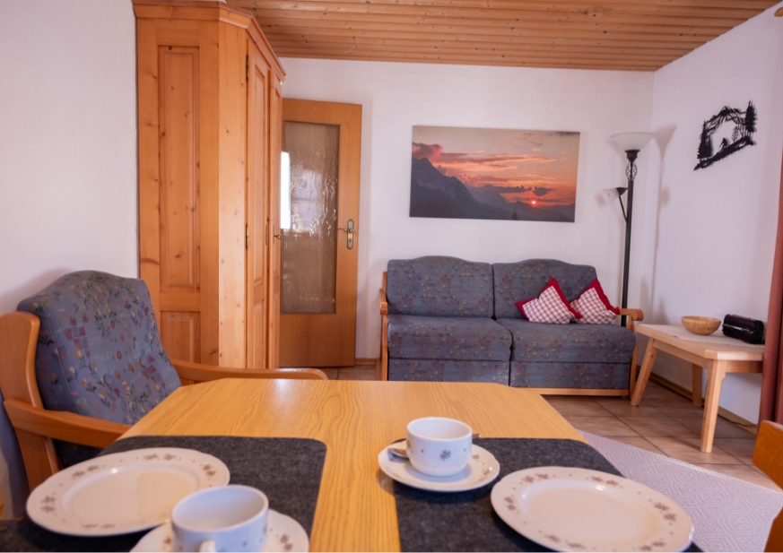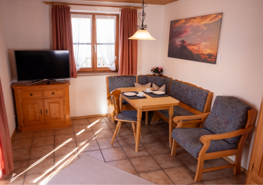 Die nach Südwesten gelegene Wohnung mit Blick auf Wetterstein und Kranzberg verfügt über ein separates Schlafzimmer mit Komfortbetten, ein gemütliches Wohnzimmer mit Couch, Sitzecke, großem Flachbild-TV, Radio und Safe, sowie ein modernes Bad mit Dusche und WC. In der voll ausgestatteten Einbauküche mit Induktionskochfeld finden Sie alles, um sich selbst zu versorgen.